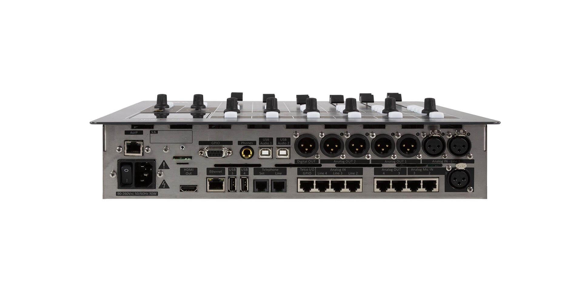 La sortie HDMI, associée à 4 potentiomètres rotatifs, permet une programmation rapide et intuitive de tous les paramètres de la console de mixage.