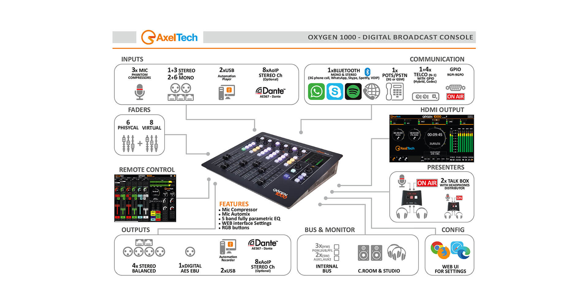 Fiable et facile à utiliser comme une console de mixage analogique, l’Oxygen 1000 propose des fonctionnalités de premier ordre : faible latence, préréglages utilisateur, touches intelligentes, égaliseur, compresseurs, fonction hybride téléphone, sortie HDMI, E/S analogiques et numériques, USB, Bluetooth, Dante™ AoIP, fonction Telco et talkbox présentateur.