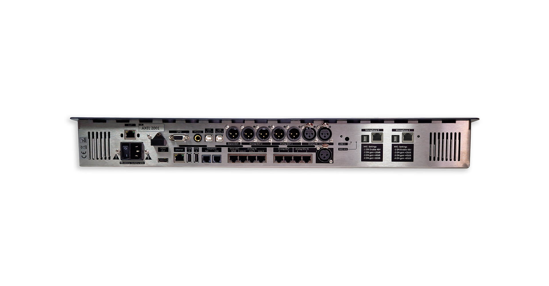 • Micro 1 sur XLR, micros 2 à 5 sur RJ45, toutes symétriques avec alimentation fantôme +48 V et GPIO